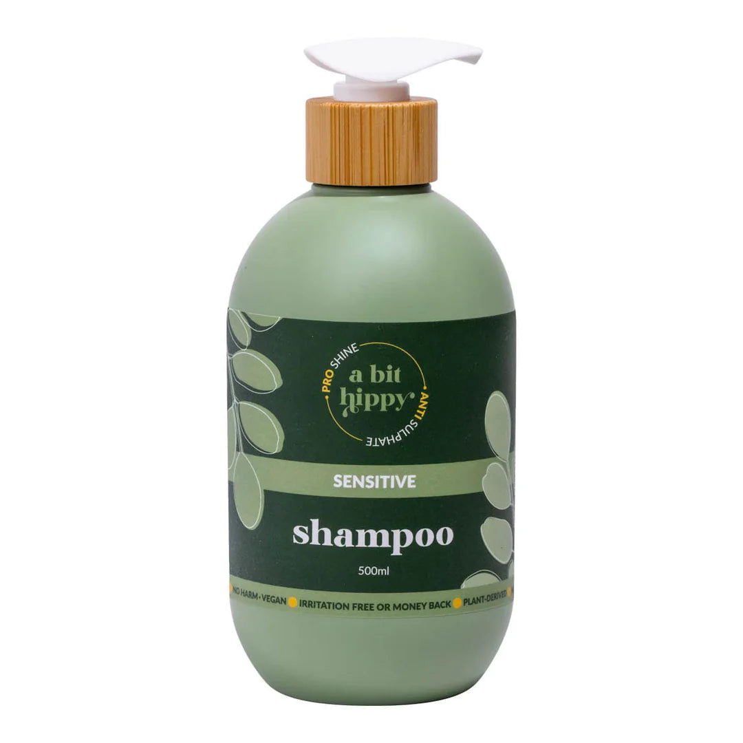 A Bit Hippy Sensitive Shampoo features a clever combination of gentle plant-based cleansers and a non-irritating essential oil blend. It contains cationic guar gum (derived from guar beans) to strengthen damaged hair, care for sensitive or dry scalps, and provide hydration.