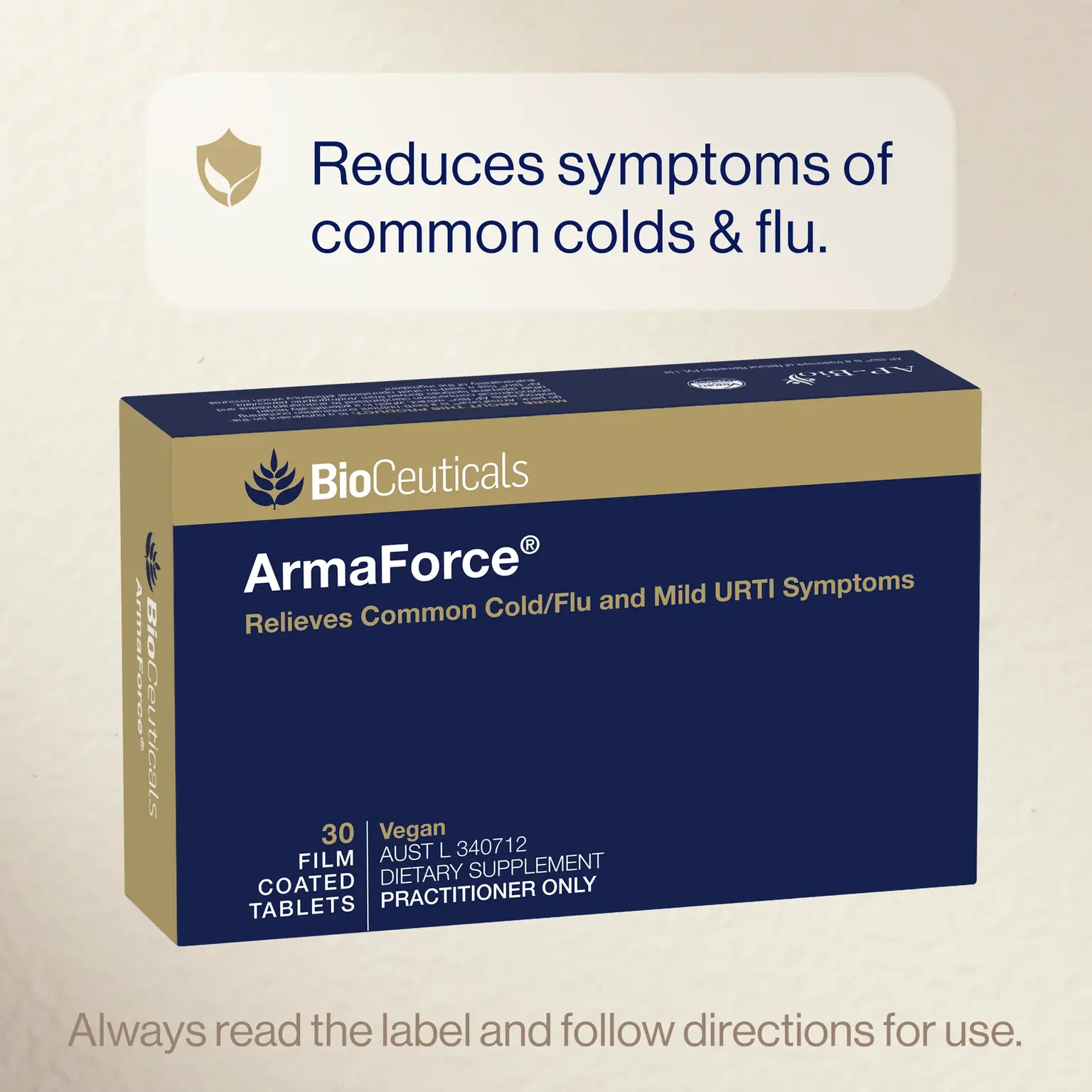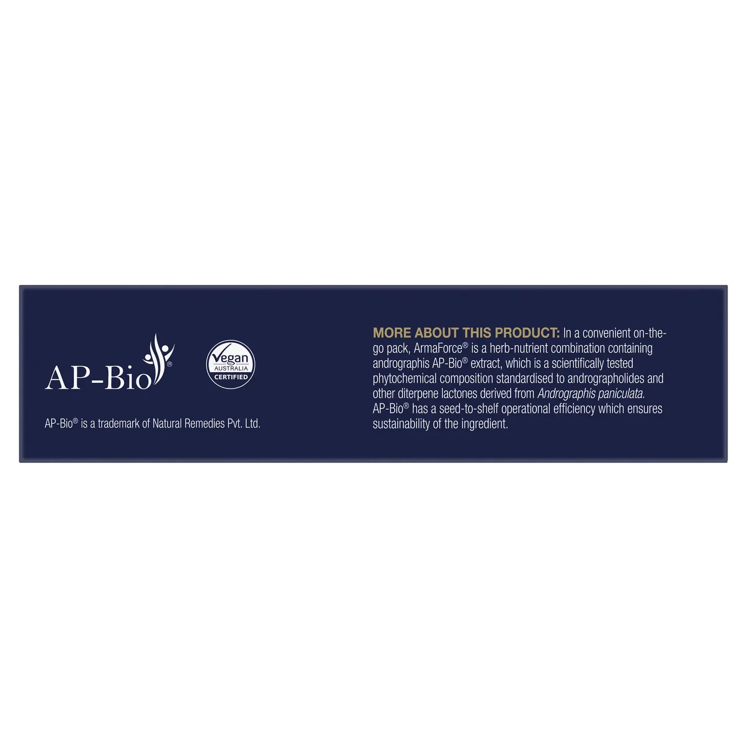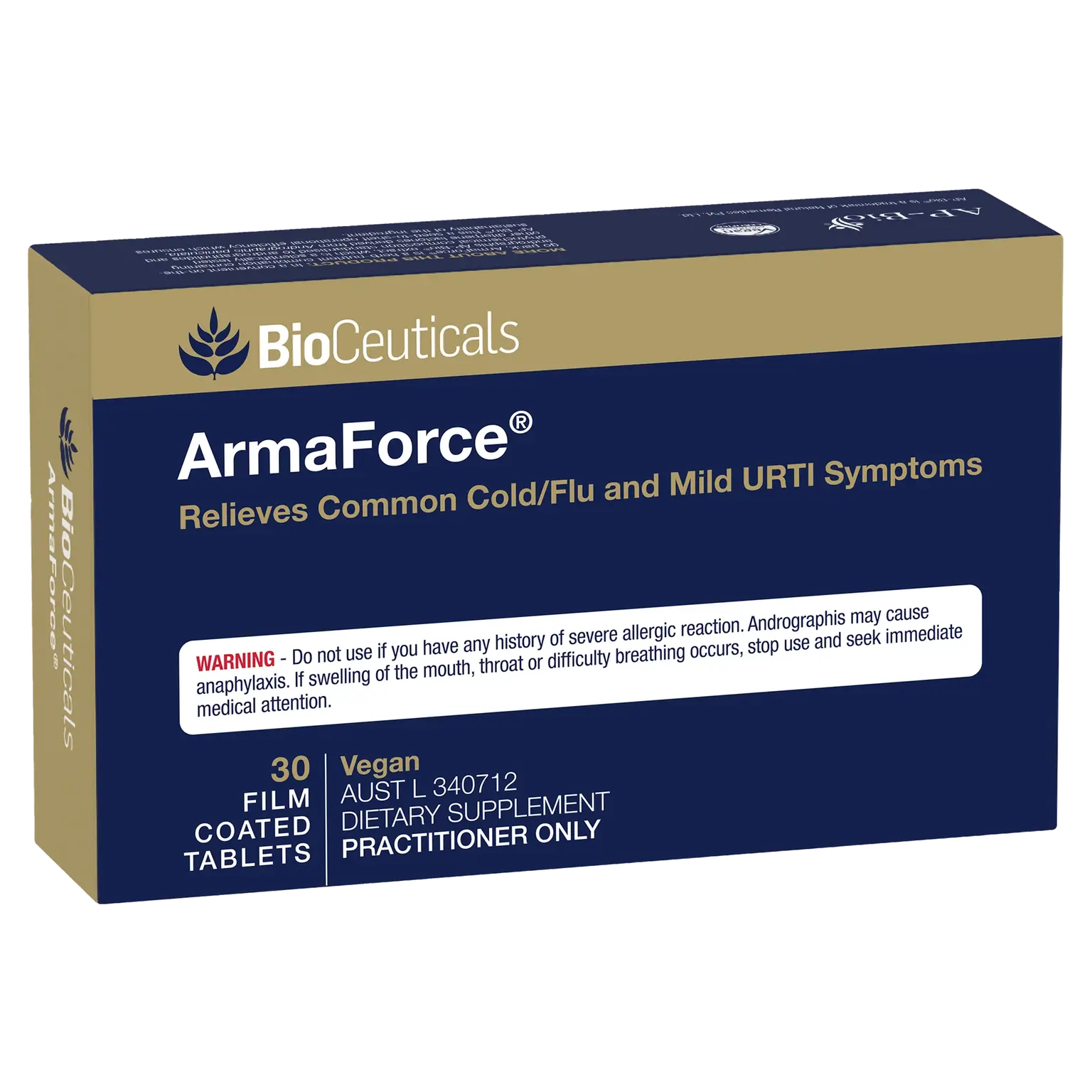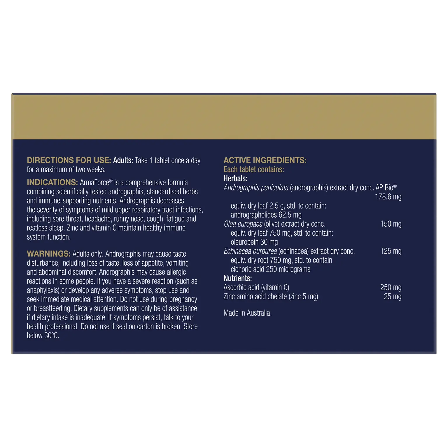 ArmaForce® is a comprehensive cold and flu supplement combining clinically trialed andrographis and immune-supporting nutrients. Andrographis decreases the severity of symptoms of mild upper respiratory tract infections, including sore throat, headache, runny nose, cough, fatigue and restless sleep. Zinc and vitamin C maintain healthy immune system function.ArmaForce® contains andrographis AP-Bio extract. Which is a scientifically tested phytochemical composition standardised to andrographolides and other diterpene lactones derived from Andrographis paniculata.
