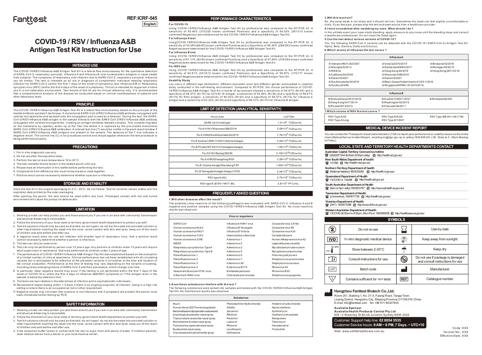 Fanttest Plus RSV/COVID-19/Influenza A&B Antigen Test Kit – 1 Test. This single-use kit is designed for easy and quick detection of four respiratory infections: RSV, COVID-19, and Influenza A&B. The test is suitable for people with symptoms. Minors must be tested with the assistance of an adult.