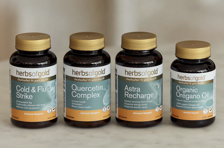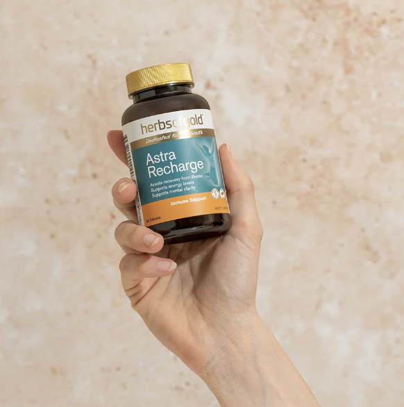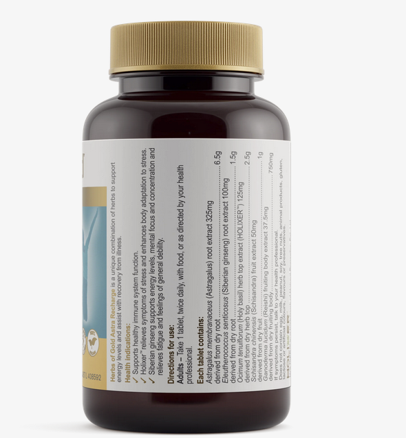 Herbs of Gold Astra Recharge is a comprehensive herbal formula that contains Astragalus and Holy basil plus Siberian ginseng to support energy levels and assist with recovery from illness.