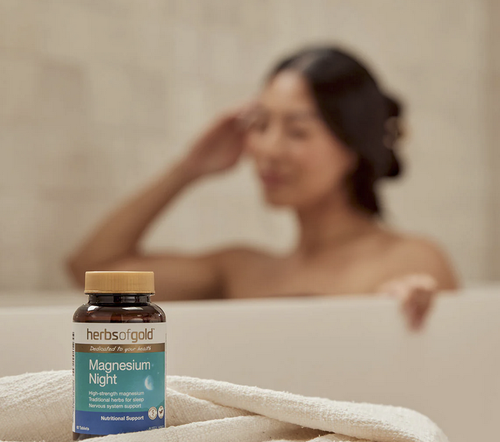 Herbs of Gold Magnesium Night contains a unique combination of magnesium plus Passionflower and California poppy for night-time use.