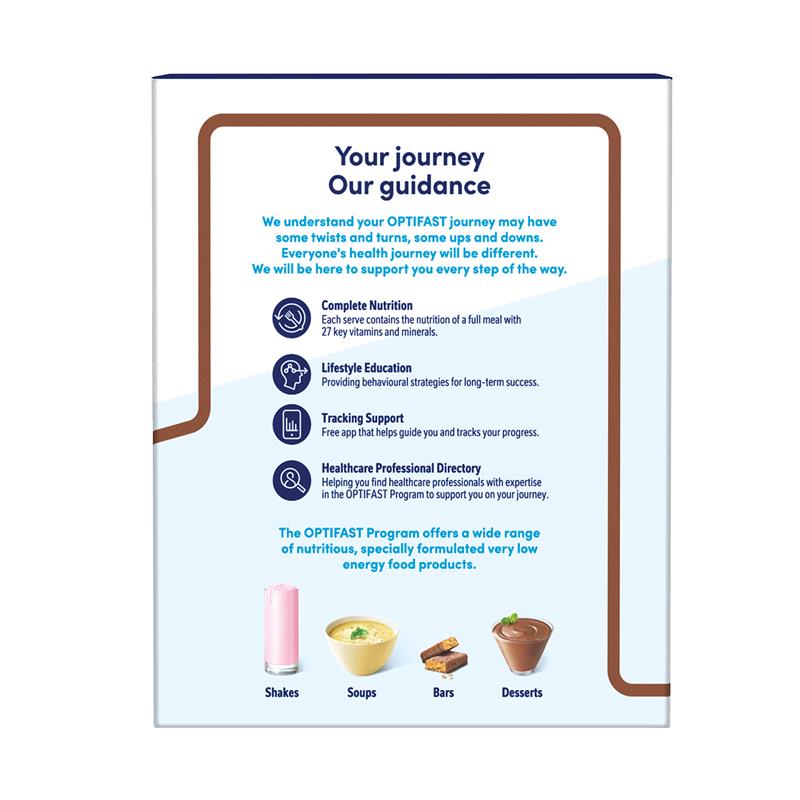 The OPTIFAST Program is scientifically designed to help you achieve effective weight loss results. Whichever program level you're on - OPTIFAST VLCD Shakes can be used to replace one, two or three meals. If you like to mix it up, look at our variety of OPTIFAST VLCD Bars, Soups, and Desserts and build a mix of meal options that suit your preferences and taste buds. This means you can eat, drink or sip and enjoy!