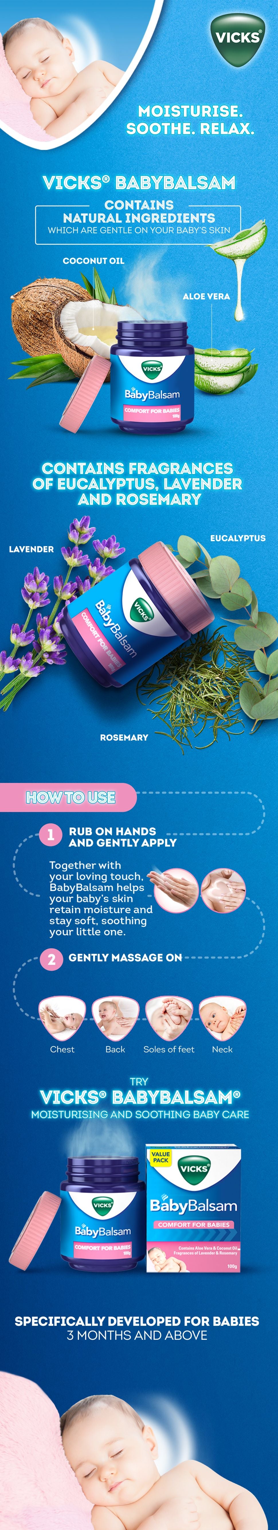 Moisturize. Soothe. Relax. Vicks BabyBalsam is specially developed for babies 3 months and above.
